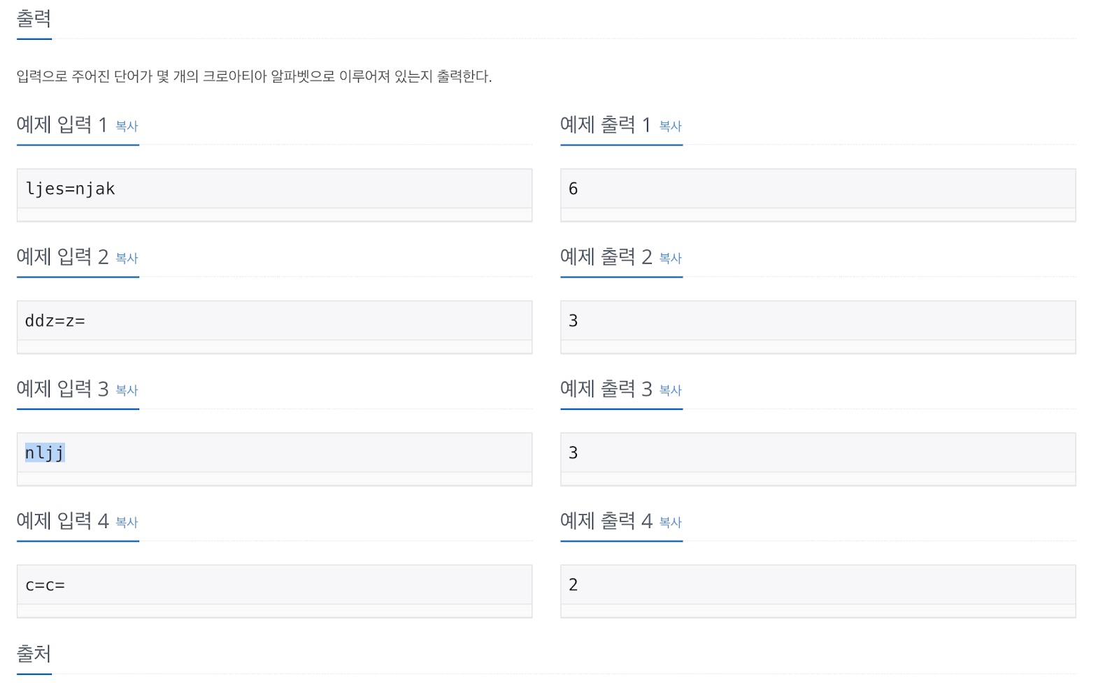 입력된 문자열을 비교했을때, 동일한 크로아티아알파벳이 연속될 경우 중복처리를 해줘야함.