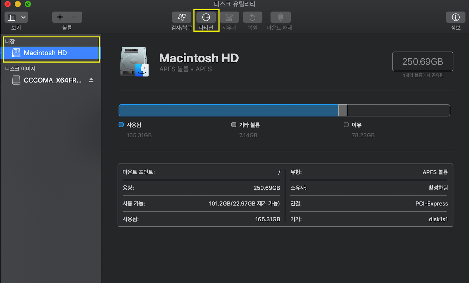 현재 저는 부트캠프가 없는 상태이므로 파티션이 한개밖에 안뜹니다.