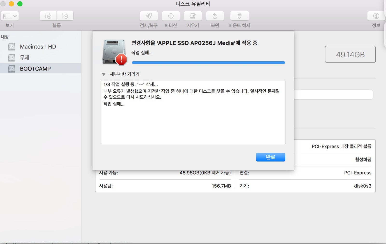 하지만 부트캠프에서 윈도우 설치중에 파티션만 분할되고 오류가떠서